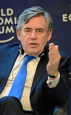 James Gordon Brown (born 20 February 1951) is a British politician who served as Prime Minister of the United Kingdom and Leader of the Labour Party from 2007 to 2010. Previously, he was Chancellor of the Exchequer from 1997 to 2007 under Tony Blair. Brown was Member of Parliament (MP) for Dunfermline East from 1983 to 2005 and for Kirkcaldy and Cowdenbeath from 2005 to 2015. He has served as United Nations Special Envoy for Global Education since 2012,[3] and he was appointed as World Health Organization Ambassador for Global Health Financing in 2021.[4]
