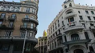 The Gran Vía serves as a showcase of early 20th-century revival architecture, with architectural styles ranging from Vienna Secession style, Plateresque, Neo-Mudéjar, and Art Deco, among others.[1]