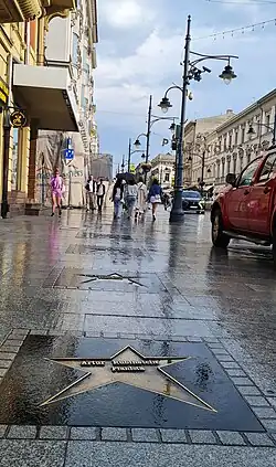 The hotel featured prominently in Polish literature and cinema throughout its history, which contributed to its fame within Poland.[38] Writer Władysław Reymont, recipient of the 1924 Nobel Prize in Literature, described its high renown in his novel The Promised Land (Ziemia obiecana).[11] Moreover, the sidewalk at the hotel's entrance is paved with the so-called Lodz Walk of Fame (Aleja Gwiazd) comprising brass stars with the names of prominent Polish-born actors, cinematographers, film directors and producers.[39] Among the most recognisable names are the Warner Brothers, Roman Polański, Pola Negri, Ida Kamińska, Andrzej Wajda, Krzysztof Kieślowski, Jan A. P. Kaczmarek, Agnieszka Holland, Jerzy Hoffman, Jerzy Kawalerowicz, and Krzysztof Zanussi. The hotel also appeared in several films, notably: