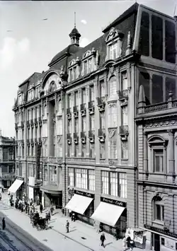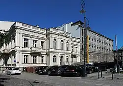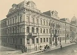 The Grand Hotel, designed in the Renaissance Revival by chief architect Hilary Majewski, was completed in two years and opened on 9 October 1887 with 45 rooms.[6][7] By 1896, the number of rooms grew to 70 and comprised a restaurant and a ballroom.[8] Nonetheless, it was still a modest establishment; only some rooms were fitted with the proper amenities, such as baths.[9] The majority of rooms possessed simple washing basins that had to be manually filled with boiled water brought in jugs or vessels by the hotel staff.[9] Heating was delivered through individual masonry heaters in each room and not by a hotel furnace or centralised heating.[10][a] However, the hotel did have marble interiors and a well-maintained garden in its courtyard.[11] Meyer sold the hotel in 1904 to a joint-stock company owned by the Bank Handlowy (Polish Commercial Bank) and, in 1906–1907, incandescent light bulbs replaced the hotel's gas lighting when it was connected with the city's electrical grid.[8] In 1911, a consortium of wealthy industrialists acquired the building from Bank Handlowy in a share buyout, with an aim to modernise it and create a more grand lodging for a growing city.[8]