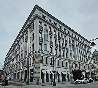 On 21 June 1908, a cinema hall was opened on the premises.[12] Following another renovation in 1912–1913 by Majewski and Dawid Lande, the hotel became a modern place of accommodation.[13] Its exterior was reshaped into Early Modernism and the number of rooms increased to 150.[13] The new amenities were very advanced for the time and included private bathrooms with regulated hot and cold water, central heating, elevators, a telephone service, a personal room call service, water carbonators,[14] ice-machines as well as a private confectionery store, bakery, restaurant, a Viennese-styled café and a beauty salon on the ground floor.[15][16] A private garden was created for hosting open-air concerts.[3] Juliusz Heinzel's son, Baron Ludwik Heinzel, became the company's largest shareholder during this period and the hotel hosted many Polish celebrities of the day.[8]