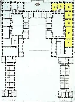 2. ^ This room originally served as the west landing of the Ambassadors’ Staircase and formed the main entrance to the grand appartement du roi.