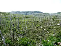 Grands-Jardins National Park protects an environment that is highly representative of the natural region of the Jacques-Cartier Lake Massif.[5] The natural environment of the park is dominated by forests. Approximately 30% of the park was ravaged by forest fires in 1991 and again in 1999. Although the landscape of these fires is not very attractive for the human eye, it is essential for the renewal of the forest and for the creation of refuges for certain species. Indeed, dead wood trunks on the ground or standing are ideal shelters for birds, rodents, insects and fungi. A few years after the fire, the forest begins to regain its appearance and slowly resumes its cycle of natural succession.