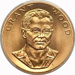 The 2004 Iowastate quarter honors Grant Wood with elements including the Schoolhouse, teacher and students planting a tree, and the caption "Foundation in Education".