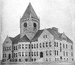 In 1896, the Great Falls Public Schools built the first Great Falls High School building.[8] City voters passed an initiative in 1893 to sell bonds to build a high school, but the Panic of 1893 delayed construction.[9] A design by local architect William White was chosen over three other proposals.[9] White's Romanesque Revival three-story structure featured a small central circular building, two rectangular wings, and an eight-story, four-faced clock tower.[9] Construction on the building, located at 1400 First Avenue North, began in 1894. The high school was built of gray sandstone obtained from quarries near both Helena and Great Falls.[9][10] The walls, which were 5 feet (1.5 m) thick at the bottom of the building but only 4 feet (1.2 m) thick at the roof, were sunk 16 feet (4.9 m) into the earth and stood on shale bedrock.[9] To compact the foundation's backfill, a herd of sheep was driven around the structure 100 times.[9][10] Wood for the interior supports, roof, and steps were cut from massive trees logged in the Rocky Mountains and floated down the Missouri River.[9][10] The finished building featured a tin mansard roof (molded and painted to look like tile), gables, and an attic suspended from the roof joists.[9] The interior woodwork was solid oak, all rooms had 3-foot (0.91 m) high wainscoting, the solid doors were 2.5-inch (6.4 cm) thick, and highly detailed molded pediments were emplaced over each door.[9] Ornate brass doorknobs and hinges were used throughout the building, and heat was supplied by cast iron radiators with delicate, filigreed covers.[9] The building (whose original cost was estimated at $59,940) was completed by McKay Brothers in 1896 at a total cost of $110,000.[8][9] The structure, which was designed to educate 500 students, contained 14 classrooms, a physical laboratory, a chemical laboratory, an art studio, and an assembly hall that could seat 400.[8] A boiler system was installed in the basement.[9]