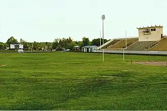 By the late 1990s, Memorial Stadium was in serious disrepair. The stadium's seating and restroom facilities were not ADA-compliant, the sidewalk on the eastern side of the stadium and the concrete steps in the east side bleachers were crumbling from over-use, poor drainage had damaged the foundation of the east side bleachers so much that their structural integrity was at risk, concession areas were too small, and the meeting rooms for home and visitor football teams were plagued by small size as well as humidity, mold, and general disrepair from overuse.[24] The cost of creating ADA-compliant facilities, fixing the drainage problem, and rebuilding the steps was estimated at $500,000.[24] Complete reconstruction of the eastern bleachers, along with improvements to concessions and team meeting spaces, was set at $2 million.[24] Despite the expense, the rebuild option had the advantage of widening the running track around the field. This would permit the track to expand from its current six lanes to 10 lanes (allowing the stadium to host the state track meet), and would also permit widening of the grass field to permit soccer games.[24] A committee of school board members and public citizens studied the issue, and recommended in November 1999 that $475,000 be spent to improve the drainage, fix the east sidewalk, make ADA-required improvements, and upgrade the team meeting room buildings.[25] But the committee reported some bad news as well. It discovered that the running track also needed to be replaced (at a cost of $400,000) because drainage problems and substrata settling had caused portions of the track to buckle and the latex surface to separate from its asphalt base.[25] The committee suggested spending up to $250,000 for a new high-tech surface (rather than replace the existing latex one).[25] Finally, the committee suggested spending $235,000 to improve exit stairs, upgrade and expand bathrooms in the west grandstand, widen aisles in the west grandstand, replace railings in the west grandstand, and replace benches and chairs throughout the stadium with aluminum seating.[25] Some committee members suggested replacing the east bleachers entirely at a cost of $1.8 million to allow for track expansion, and argued the city should seek a private donor or corporate sponsorship of the stadium to pay for the cost.[25] The school board was not receptive to this latter idea, but agreed to endorse an effort by a group of private citizens to try to raise the required $2.2 million total.[74]