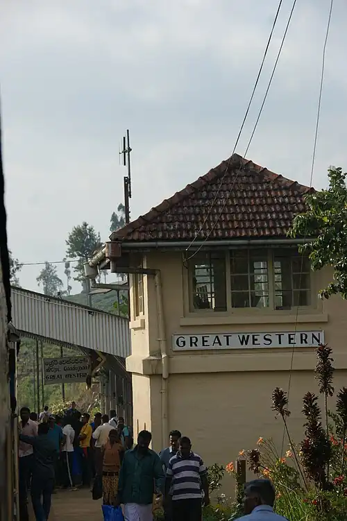 The railway station was constructed to service the Great Western Estate, a 628 ha (1,550 acres) tea plantation in the foothills of the Great Western Mountain. The estate was originally established by J. A. Rossiter in 1866.[3][4] In 1883 the estate was predominately a coffee plantation owned and operated by Dent Brothers & Co.[5] In 1893 following the construction of the railway station the ownership of the estate was transferred to the Great Western Tea Company of Ceyon, Ltd.[6]