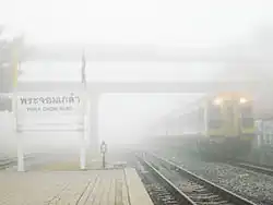 The Maeklong Railway (also known as the Mae Klong Railway) is a 1,000 mm (3 ft 3+38 in) (Metre gauge) railway that runs for nearly 67 kilometres (42 mi)[1] between Wongwian Yai, Bangkok, and Samut Songkhram in Central Thailand. The line consist of two sections: the eastern Mahachai Line, which runs between Wongwian Yai and Mahachai; and the Ban Laem Line, which runs between Ban Laem and Maeklong. The two stretches are separated by the Tha Chin River at Samut Sakhon. The only way to connect between the stations on the opposite sides of the river is by boat.[2]