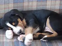 The Greater Swiss Mountain Dog (German: Grosser Schweizer Sennenhund or French: Grand Bouvier Suisse) is a dog breed which was developed in the Swiss Alps. The name Sennenhund refers to people called Senn or Senner, dairymen and herders in the Swiss Alps. Greater Swiss Mountain Dogs are almost certainly the result of indigenous dogs mating with large mastiff-type dogs brought to Switzerland by foreign settlers.[1] It was assumed to have almost died out by the late 19th century, since its work was being done by other breeds or machines, but was rediscovered in the early 1900s.[2]