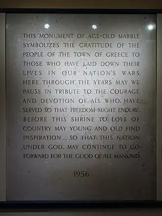 3. ^ "Scattered treasures recall Greece Memorial Hall". www.democratandchronicle.com. Democrat and Chronicle. October 10, 2014. Retrieved September 13, 2019. The new town hall was built in 1997. Two years later, the Greece Memorial Hall was demolished. The old wooden mahogany seats that were once in the hall's auditorium are now on the north end of Town Hall, near the town clerk's office. And that bronze plaque naming all those who fought was also saved and now hangs in the Town Hall's main hallway.