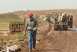95% of structures within the city limits of Greensburg sustained some degree of tornado-related damage.[59] Around 800,000 cubic yards (610,000 m3) of tornado-related debris was removed from Greensburg in the aftermath of the tornado.[60] Initial recovery attempts in the days following the tornado were constrained by the disruption of electricity and by other hazardous conditions that made it difficult to clean up the town.[61] Then-President George W. Bush declared a disaster area in the state of Kansas.[62] Immediately after the tornado, the United States Environmental Protection Agency (EPA) dispatched on-scene coordinators to Greensburg; the agency was tasked with addressing fuel releases and mitigating damaged transformers.[63] The EPA left Greensburg in June 2007, a little over a month after the tornado, although it remained on standby.[64]