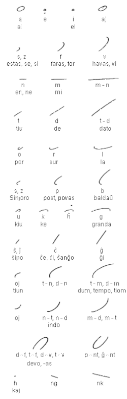 Gregg Shorthand Alphabet, with letters and words from Esperanto