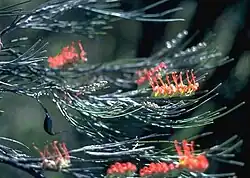 Grevillea cagiana, commonly known as red toothbrushes,[3] is a species of flowering plant in the family Proteaceae and is endemic to the south-west of Western Australia. It is an erect or spreading shrub with simple or divided leaves with linear lobes, and green, yellow, orange or pink flowers with red styles.