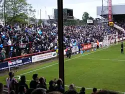- New Road Stand – A single-tiered all-seated stand located along the New Road.[49] During its final years it was officially named the Bill Axbey Stand, as a tribute to the club's oldest-ever supporter.[54] The away supporters' section was housed in the northwest corner of the stand until October 1991.[55] Previously a terrace, the stand was converted to seating during the 1996 off-season.[1] In 2010, at the request of then-manager Andy Scott, the dugouts were relocated in front of the stand.[56][57] The central camera position for TV broadcasts of games was located in a gantry suspended from the roof of the stand.[58] The Family Section was located in blocks N506, N507 and N508.[26]