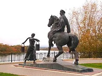 The sculpture composition illustrate one of the elements of the epic novel And Quiet Flows the Don. Monument is located on the left bank of the river Don. The monument is 6.5 m height. Barefoot Aksinya comes towards the khutor with a carrying pole. She is dressed in wide skirt and neck-flap. The sculptor captured the moment when Grigory, during a friendly conversation with his neighbor Aksinya, jokingly blocked off her path.[1] A passage from And Quiet Flows the Don, which was immortalized in bronze: