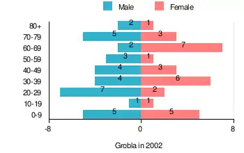 According to the 2002 Poland census, there were 62 people residing in Grobla village, of whom 53.2% were male and 46.8% were female. In the village, the population was spread out, with 19.4% under the age of 18, 37.1% from 18 to 44, 12.9% from 45 to 64, and 30.6% who were 65 years of age or older.[1]