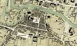Grodzka Street is a historical street in Old Town of Bydgoszcz, Poland. The street is located in the northern part of the Old Town: it stretches along Brda River waterfront, following an east–west axis. The street starts at the intersection with Bernardyńska street and ends at Tadeusz Malczewski street's crossing. Its length is approximately 430 m. The Grodzka Street was laid out in mid-14th century, when Bydgoszcz became a charter city.[1] Grodzka Street buildings vary greatly one from the other, beginning with the three historic granaries from late 18th century, to the all-glass similar-shape modern mBank in Bydgoszcz, which became an icon of Polish architecture.
