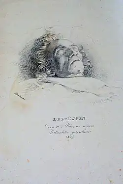 Why the notoriously stubborn Beethoven readily agreed to replace the fugue is unclear: some historians have speculated he did it for the money, as Beethoven perennially struggled to manage his personal finances and often lacked money. Others suggest he did it to satisfy his critics or because he believed the fugue stood best on its own.[13] The fugue is connected to the other movements of Op. 130 by various hints of motifs, and by a tonal link to the preceding Cavatina movement (the Cavatina ends on a G, and the fugue begins with the same G).[14] The lively final movement which replaced the fugue is in the form of a contredanse and is completely uncontroversial. Beethoven composed this replacement finale while staying at the estate of his brother Johann in Gneixendorf during the late autumn of 1826, and it is the last complete piece of music he was to write. In May 1827, about two months after Beethoven's death, Matthias Artaria published the first edition of Op. 130 with the new finale, the Grosse Fuge separately (under the French title Grande Fugue) as Op. 133, and a four-hand piano arrangement of the fugue as Op. 134.[15]