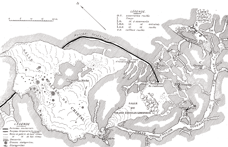 Longitudinal section of the Cave of Rosée, as published in E. Van den Broeck, E.-A. Martel and Ed Rahir, Les cavernes et les rivières souterraines de la Belgique étudiées spécialement dans leurs rapports avec l'hydrologie des calcaires et avec la question des eaux potables, T. II, Les calcaires carbonifériens du bassin de Dinant et coup d'œil sur le bassin de Namur, H. Lamertin, Brussels, 1910.