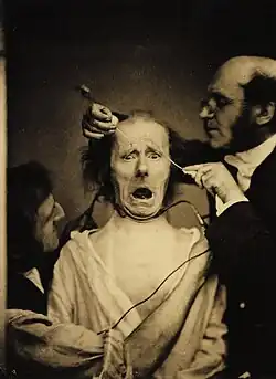 Duchenne was convinced that the truth of his pathognomic experiments could only be effectively rendered by photography, the subject's expressions being too fleeting to be drawn or painted. "Only photography," he writes, "as truthful as a mirror, could attain such desirable perfection."[15] He worked with a talented, young photographer, Adrien Tournachon, (the brother of Felix Nadar), and also taught himself the art in order to document his experiments.[16] From an art-historical point of view, the Mechanism of Human Physiognomy was the first publication on the expression of human emotions to be illustrated with actual photographs. Photography had only recently been invented, and there was a widespread belief that this was a medium that could capture the truth of any situation in a way that other mediums were unable to do.