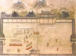 In 1404, King Taejong (r. 1400–1418) ordered that the palace Changdeokgung be established in Hanyang.[15] Upon his return to the city in 1405, he began to reside in that palace. In 1406, he began efforts to repair Gyeongbokgung.[16] Although he repaired and expanded Gyeongbokgung, Taejong functionally avoided it, possibly because he associated it with unpleasant memories of political turmoil. He primarily resided in Changdeokgung instead.[17] Until the Imjin War, Taejong and his successors had Gyeongbokgung as their official palace (법궁; 法宮; pŏpkung), but had secondary palaces (이궁; 離宮; igung) that they often resided in more or moved between.[18]