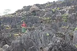 The topography of the province of Hà Giang is fairly complex: "temperate, but highly localized montane weather patterns create variable conditions among different regions".[13] It has impressive limestone and granite peaks and outcrops. It has three regions. Climatically, it has two seasons, dry and monsoon, dependent on the altitude of the region. The two northern Indochinese climatic zones on the border influence the climate in the northern part of the province. The lower areas in the province comprise low hills, the Lô River Valley and Hà Giang city.[8][13] In Cao Bồ district, the dry season lasts from mid-September until the end of May, and the monsoon season lasts from the beginning of June until mid-September. However, in Du Già district the wet season sets in one month earlier. The average annual temperature in the provincial capital of Hà Giang is 22.78 °C (73.00 °F); the monthly averages range from a low of 15.48 °C (59.86 °F) in January to a high of 27.88 °C (82.18 °F) in July. The annual rainfall in Hà Giang city is 2,430.1 millimetres (95.67 in); the monthly average varies from a low of 31.5 millimetres (1.24 in) in December to a high of 515.6 millimetres (20.30 in) in July. The average annual humidity level is 84%.[13]