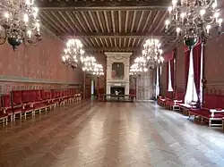 After a major fire destroyed much of the structure in 1486, it was rebuilt with the northern wall being completed in 1492, and the western wall being completed in 1498.[6] The design involved crenelated walls, corner turrets and a large arched opening in the western wall. The Grande Galerie (the great gallery) in the centre of the building was completed in 1606, and a narrow property known as the Bâtiment des Échevins (Aldermen's House) on the east side of the building, adjoining Rue des Gentilshommes, was acquired in 1607.[7] The Salle des Fêtes (the ballroom) was created above the great galley and featured a fine fireplace, incorporating a copy of a painting by Frans Pourbus the Younger depicting Henry IV.[8]