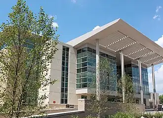 The new school opened in 1972 at 55th and Eads Streets NE and was named Howard Dilworth Woodson Senior High School. Described as the first high-rise high school in the country,[5] it consisted of a seven-floor tower above a plaza and a ground floor with a greenhouse on the roof, and elevators and escalators that took students and faculty up and down the tower. Initially, the building's size and shape ran into obstacles with the planning boards. However, H.D. Woodson's son, Granville Woodson, the chief of the DCPS buildings department, argued successfully that the size and shape of the new school was precisely the point and made the school the focus of the community by appearing as significant as possible.[6] The school resembled a modern office building with a large outside pedestrian plaza, a surface parking lot for 200 vehicles, and a stadium with track, athletic fields, and tennis courts. A student contest to create a slogan for the building resulted in the nickname "the tower of power".[6]