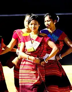 Women of this tribe chiefly wear pathin,[11] a wrap-around skirt that covered the upper and lower part of the body from the bust till the calf of the leg. Women in the upper class wore a long pathin which fell down to the floor while women in the lower class wore a shorter pathin which length reaches to the ankle. The pathin is a horizontally striped, colourful, rectangular piece of cloth with alternate layers of different colours between red stripes and thick horizontal borders. The pathin, also called pate or pâthni, consists of two main sets of stripes: the kan and the gao. If the pathin is observed with the stripes parallel to the horizon, the kan appears to be on the top and bottom ends of the pathin, while the gao is the larger central portion of the pathin. Red is the main colour used in the rangapathin, which is worn by young women; while middle-aged women tend to wear pathins with lesser stripes in shades of green. Women, while working on the fields use the kompes as a banong or belt. The compes is a brocaded scarf mostly used by men, but often women use it to tie their waists. Menfolk wear a woven piece of cloth called ningti or bhijâ kapur, it is worn in the fashion of a dhoti. During winters, both men and women cover their bodies with a traditional brocaded shawl called Argon[11] and men keep their necks warm with a kompes. Other kind of clothes used by the Hajongs are gamsa similar to the Assamese gamosa and pasra, an embroidered light shawl. Buksuli is the traditional shirt used by men.