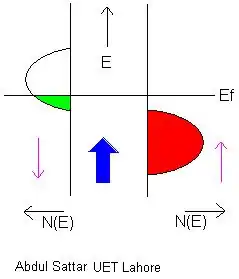 The electronic structure of a half-metal. is the Fermi level, is the density of states for spin down (on the left) and spin up (on the right). In this case, the half-metal is conducting in the minority spin channel.