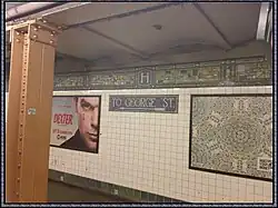 Both platforms have their original mosaic tile band that is colored blue and green with yellowish accents.[18] "H" tablets on blue background run along the tile bands at regular intervals.[18] The name tablets read "HALSEY ST." in gold serif font on a blue background and a green, yellow, and blue border.[18] There are also directional signs in gold serif font and outline on a blue background.[18] One of the platforms formerly had two bathrooms. Yellow i-beam columns run along both platforms at regular intervals with alternating ones having the standard black station name plate in white lettering.[18]