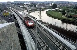 In the vicinity of the Fulda Viaduct in Kragenhof (km 133), the high-speed line begins to run generally parallel with the north-south line, which it will follow for nine kilometres to the southern outskirts of Kassel.[10] The line passes the western edge of the Kassel marshalling yard and reaches Kassel-Wilhelmshöhe station at route kilometre 144. The station, which was newly built as part of the high-speed line, bypasses the Kassel Hauptbahnhof terminus. In the Kassel area, the line runs for around 15 kilometres next to existing lines.[11]