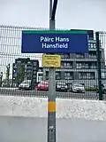 The station was planned by Fingal County Council as part of Hansfield Strategic Development Zone.[2] While the railway line was opened in September 2010 as planned, Hansfield station remained closed because no road access to the station from the surrounding housing estates existed.[3] When funding was provided in 2011 for the access road,[4] Iarnród Éireann took possession of land to proceed. The station opened on Friday 28 June 2013.[5]