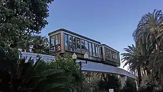 The tram consists of a single elevated track, with a single 2-car train running back and forth between the two stations. It uses rubber tires and was cable hauled.[12] It operated as a fully automated guideway system.[13] The train has a total capacity of 120 passengers. One-way capacity is 1,800 passengers/hour.