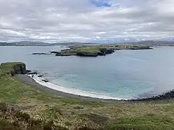 Harlosh Skerry lies just offshore to the north west, upon which seals can be seen frequently. At low tide on the northern coast there is a large sandy bay, however, watercraft should take caution when attempting to land in the bay as several rock formations pose a navigational hazard at low tide.