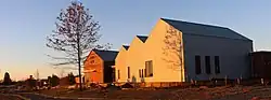 Rear view of the visitors center, showing the distinctive zinc siding of the three exhibit buildings and the wood siding of the administration building.