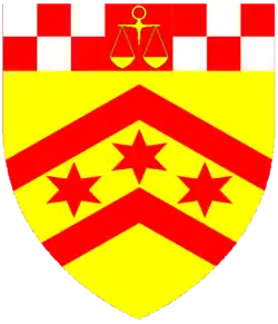 Or between two chevronels three mullets six points Gules a chief chequy Argent and Gules thereon a pale Gules charged with a pair of scales Gold.