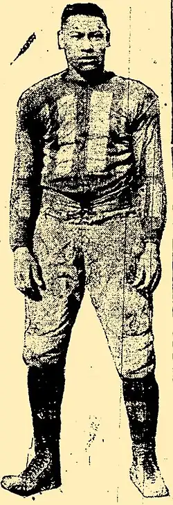 Ward teamed up with Halley Harding at Wilberforce University as a running back and placekicker. Called upon heavily during games, he was described in one account as a "consistent gainer" with "the speed of a Mercury."[1] In 1925, Ward experienced a breakout season, running for 98 yards in a single quarter against Linden Center in Dayton, Ohio and scoring three touchdowns against Lincoln. He scored an additional three touchdowns against Kentucky State, gathering the attention of Pittsburgh Courier, which stated "Ward is never completely stopped. Aside from his running, Ward is a deadly tackler, a good punter, a good passer, and is first on the interference."[2] At the end of the season, Ward was named to the fullback position of the newspaper's very first All-American team.[3] In 1926 he missed time due to injuries from running a nail into his hand.,[4] but stayed true to form when he was on the field, scoring a 98 yard touchdown during a 16–0 win over Bluefield Institute.[2] He made national headlines again in late October when he intercepted a pass and scored an 80 yard touchdown in a 7–0 win over Lincoln at Forbes Field in Pittsburgh.[5] Ward wrapped up his college football career on Thanksgiving Day in 1928, kicking a game-tying field goal in the closing moments of a 13–13 tie against West Virginia State in Cleveland.[6]