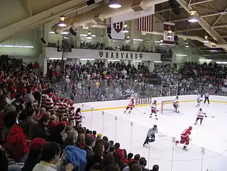 The Harvard Crimson men's ice hockey team is a National Collegiate Athletic Association (NCAA) Division I college ice hockey program that represents Harvard University. The Crimson are a member of ECAC Hockey. They play at the Bright Hockey Center in Boston, Massachusetts.[2] The Crimson hockey team is one of the oldest college ice hockey teams in the United States, having played their first game on January 19, 1898, in a 0–6 loss to Brown.[3]