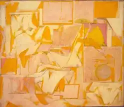 In the late 1960s and 1970s, situated in settings like the Whitney Biennials, his paintings were easily recognized among the crowd due to his masterful use of shaped canvases.[9] They were large, often curved, and frequently enclosing wall space. The painting itself blended elements from abstract expressionism and geometric abstraction, over time shifting further towards geometry. The surfaces were never simple. By the 1980s, he returned to the rectangular and square canvas, and eventually to the cruciform (cross) shape, which would become a focus for the next decade. "Harvey Quaytman's shaped canvases are among the most impressive;"[10] and "Some of the best shaped canvases of the last two decades have come from Harvey Quaytman. But in this selection of new work, the painter has, so to speak, drawn in his horns, confining himself to the right angle and in most cases to a cruciform image." -Vivien Raynor, New York Times, 1986[11]