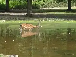 The Haute Touche Zoological Park (French: Réserve zoologique de la Haute-Touche, pronounced [ʁezɛʁv zɔɔlɔʒik la ot tuʃ]) is a zoo and safari park in France. It is located in Obterre, and is part of the Muséum national d'histoire naturelle.[2] The zoo was established in 1958 and opened to the public in 1980.[3] It is located in the heart of the Regional Natural Park of Brenne in the territory of the municipality of Obterre in the department of Indre, in a forest of 480 hectares (1,200 acres)[1] of which 100 hectares (250 acres) are open to the public. The zoo has animals in semi-freedom, in relatively large enclosures. Visitors can see about 920 animals from 85 species[1] and five continents, including a remarkable collection of deer. The park includes several sections, including European fauna such as Alpine ibex, European bison, gray wolves and wild boar, threatened ungulates such as Formosan sika deer, Père David's deer and scimitar oryx, and general fauna from the Americas, Asia and Africa such as big cats, hyenas, baboons, lemurs, giraffe, antelopes and birds.[2]