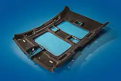 A headliner often is a composite material that is adhered to the inside roof of automobiles, aircraft, and yachts. It typically consists of a face fabric with nonwoven or foam backing. Headliners consist of multilayered composite materials that bring together multiple functionalities, including the requested look, feel, stiffness, and sound reduction needed in cars. Automotive headliners are optimised with respect to head impact counter measures[1] or to integrate additional LED lighting film behind the fabric. Most headliners consist of a tricot knit fabric that is napped to provide a soft touch and uniform appearance. The fabric is adhered to melted polyurethane foam. This fabric-foam composite is glued to the interior fiberglass roof of the automobile.