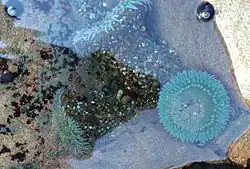 Tidepool at North Moonstone beach, in the southern part of the State Park. Giant Green anemones with black tegula snails.