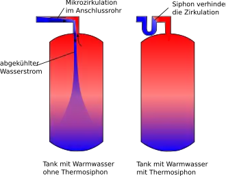 Heat traps are very simple and inexpensive. They are an effective way to prevent cooling of hot water in water heaters by thermosyphoning the hot water to a higher elevated portion of the piping system. Thermosyphoning is based on natural convection. Hot water rises and is then displaced by cold water beneath it. The heat trap stops this process, thus keeping the hot water inside the insulated storage tank.[2]