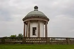 Designed by James Wyatt in 1800 for Thomas Egerton, 1st Earl of Wilton, the ornamental temple is a simple, small rotunda of Tuscan columns with a domed roof and lantern. This Grade II listed building stands on the highest point of the city of Manchester giving views across the golf course, which was originally the deer park.[29] It has its own fireplace and is thought to have been used as an observatory by the Earl who is known to have owned a telescope bought from Dollond's of London. The cost of the telescope was £18.5s.0d (£18.25) – the same amount earned in a year by the Earl's under-butler. The temple has recently been enclosed by a stone balustrade and gravelled path and is used as a summer studio for artists, and for astronomy sessions.[12]