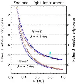 - ^ a b Leinert, C.; Richter, I.; Pitz, E.; Planck, B. (November 1981). "The zodiacal light from 1.0 to 0.3 A.U. as observed by the HELIOS space probes". Astronomy and Astrophysics. 103 (1): 177–188. Bibcode:1981A&A...103..177L. Retrieved 12 October 2022.