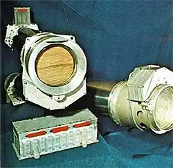 The instrument consisted of two impact ionization time-of-flight mass spectrometers and was developed by PI Eberhard Grün, Principal Engineer Peter Gammelin, and colleagues at the Max Planck Institute for Nuclear Physics in Heidelberg. Each sensor (Ecliptic sensor and South sensor) was a 1 m long and 0.15 m diameter tube with two grids and a venetian blind type impact target in front, several more grids, a 0.8 m long field-free drift tube and an electron multiplier in the inside.[4] Micrometeoroids hitting the venetian blind type impact target generate an impact plasma. Electrons are collected by the positively biased grid in front of the target while positive ions are drawn inward by a negatively biased grid behind the target. Part of the ions reach the time-lag focusing region from which they fly through the field-free drift tube at −200 V potential. Ions of different masses reach the electron multiplier at different times and generate a mass spectrum at the multiplier output. Impact signals are recorded by charge-sensitive preamplifiers attached to the electron grid in front and the ion grid behind the target. From these signals together with the mass spectrum the mass and energy of the dust particle and the composition of the impact plasma are obtained.