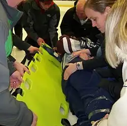 The National Collegiate Athletic Association in its advice to athletic trainers and team physicians, contained in the NCAA Sports Medicine Handbook, advises that the helmet should never be removed from an injured athlete, conscious or unconscious, with a suspected or potential head or neck injury during pre-hospital management. In this advice, certain assumptions are made. The first is that the facemask can be removed so that airway care, if needed, can be carried out. The second is that the helmet fits securely so that supporting the helmet will support the athlete's head and neck. The advice accepts that helmet removal may be necessary if an ill-fitting helmet prevents the head and neck from being secured safely for emergency transport. It is also accepted that helmet removal may be necessary if, for some reason or another, the facemask cannot be removed in a reasonable time. There is general agreement that should helmet removal be required, it should only be carried out by trained personnel. The NCAA also asserts that the injured athlete should be maneuvered to a spine board for transport as a 'single unit' using a lift/slide maneuver or log-roll technique. [3]