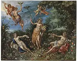 De Clerck also specialized in small cabinet paintings depicting biblical, allegorical and mythological subjects, which were collected by Brussels' aristocratic patrons.[3] Frequently he painted the figures, while collaborating with other artists, such as Jan Brueghel the Elder and Denijs van Alsloot, for the landscapes and other features.[3]