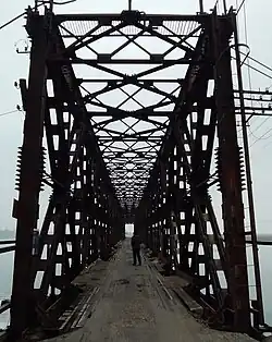 The Henichesk Bridge was built in 1915 by Waagner-Biro. In 1951, German engineers transported this bridge from the Belarussian city of Orsha towards Henichesk. This bridge replaced a wooden bridge at a similar location, which was destroyed during the Second World War.[1]